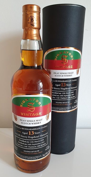 Bunnahabhain (Signatory), 13 years, 1st Fill Sherry Hogshead, 12/03/2008-24/09/2021, Cask No: 1168, 296 Bottles, Bottled for Heiners Duty-Free-Shop, 56.9 vol, Islay